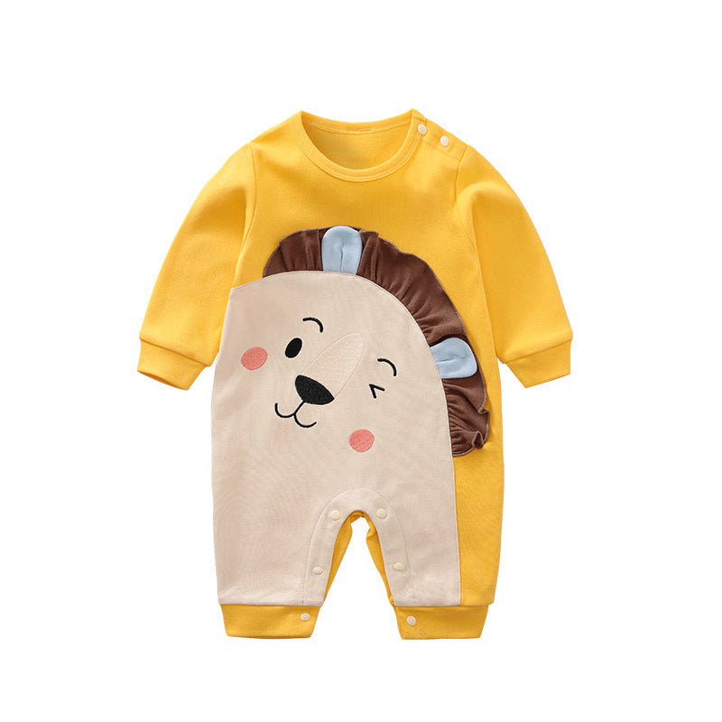 In leuchtendem Gelb und mit einem niedlichen, comicartigen Löwengesicht auf der Vorderseite ist dieser Jumpsuit aus Baumwolle perfekt für kleine Abenteurer.