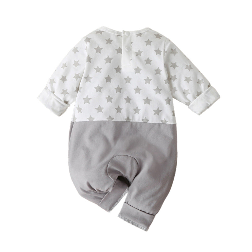 Die Kombination aus weißem Oberteil mit grauen Sternchen und einer grauen Hose verleiht diesem Jumpsuit eine zeitlose Eleganz, während Ihr kleiner Liebling sich in sanfter Behaglichkeit wie zu Hause fühlt.